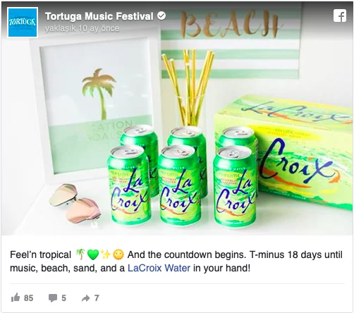 Bu tür bir ortaklığa en güzel örneklerden biri; “La Croix’in Tortuga Müzik Festivali’nin Facebook sayfasındaki tanıtımıdır” diyebiliriz. (Bu müzik festivali binlerce açık hava seven “beachgoer” gencin katıldığı büyük bir etkinliktir.) La Croix bunu, ürünleri ile ilgilenebilecek bir kitleyle bağlantı kurma fırsatı olarak gördü. Birbirleriyle rekabet etmedikleri için, markalar Tortuga’nın 100.000’in üzerindeki Facebook takipçisine ortak oldu ve ürünlerinin tanıtımını yaptı.