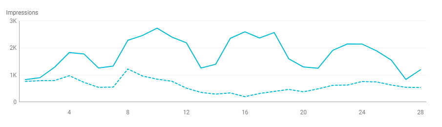Yukarıda, yapılandırılmış veri güncellemesinden sonraki bir ay boyunca müşterinin gösterim performansının anonim bir grafiği bulunmaktadır.