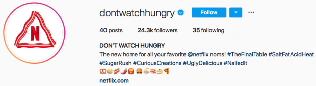 Netflix yiyecekleri, DontWatchHungry hesabını ifade eder, ziyaretçilerin bir bakışta tümüyle gıdalarla ilgili bir profile ulaştıklarını bilmelerini sağlamak için bir emoji dizisi kullanır.
